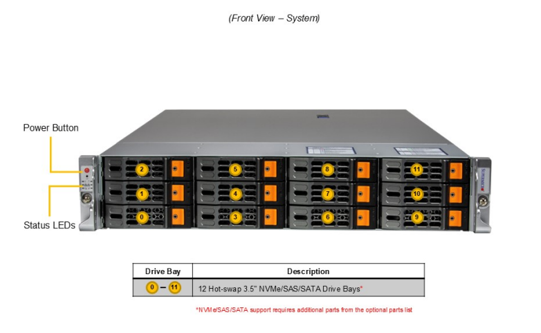 • 12 Hot-swap 3.5"/2.5" NVMe/SATA/SAS drive bays